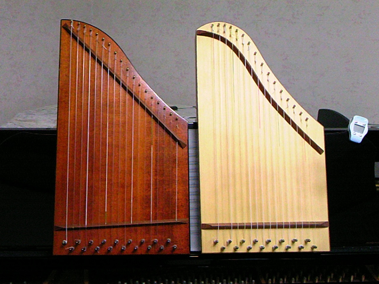 | 後ろが平らなマリアハープ・ベイビー♭ 右はナチュラル仕上げクリアな音と和音の響きが印象的。 左はオプションで、好みの色合いにできます。 |