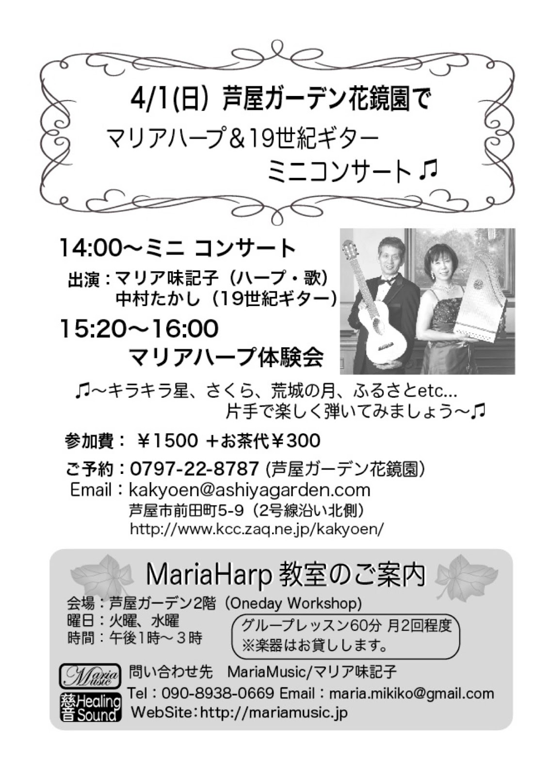 4月1日は、芦屋市にある芦屋ガーデン花鏡園でのミニコンサート。
