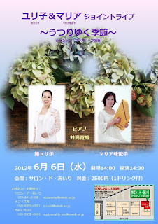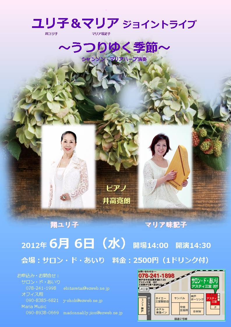 また、骨髄バンク愛の架け橋代表 翔ユリ子さんとの二人ジョイントライブが、6月6日昼下がりに 三宮サロン・ド・あいりであります〜♪こちらはワンドリンク付き¥2500 / 30席となっています。申込お待ちしています。 TEL: 090-8938-0669 MARIA MUSICまで。