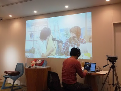 スタジをはガラス張りの中です。アナウンサー池田桂子さんとのトーク番組 |