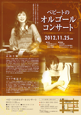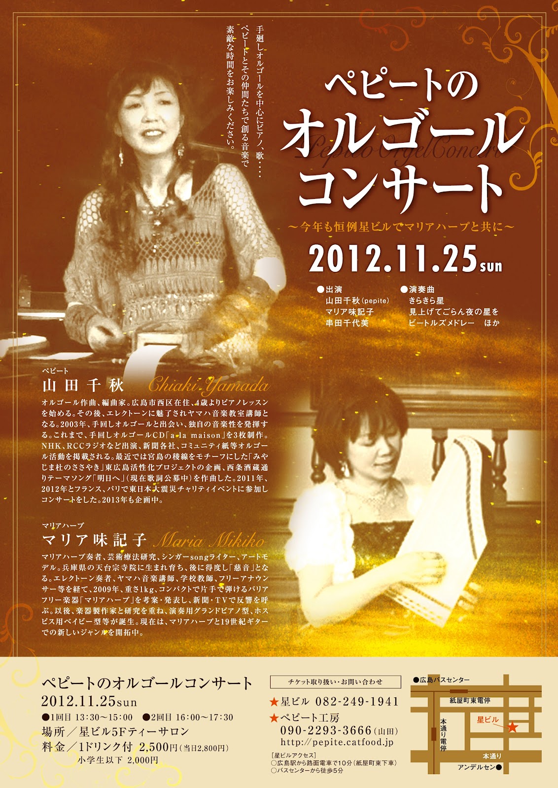 11/25(日)は、広島市内星ビルオルゴールコンサートで、ペピートさんと共演の予定です。
