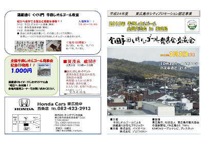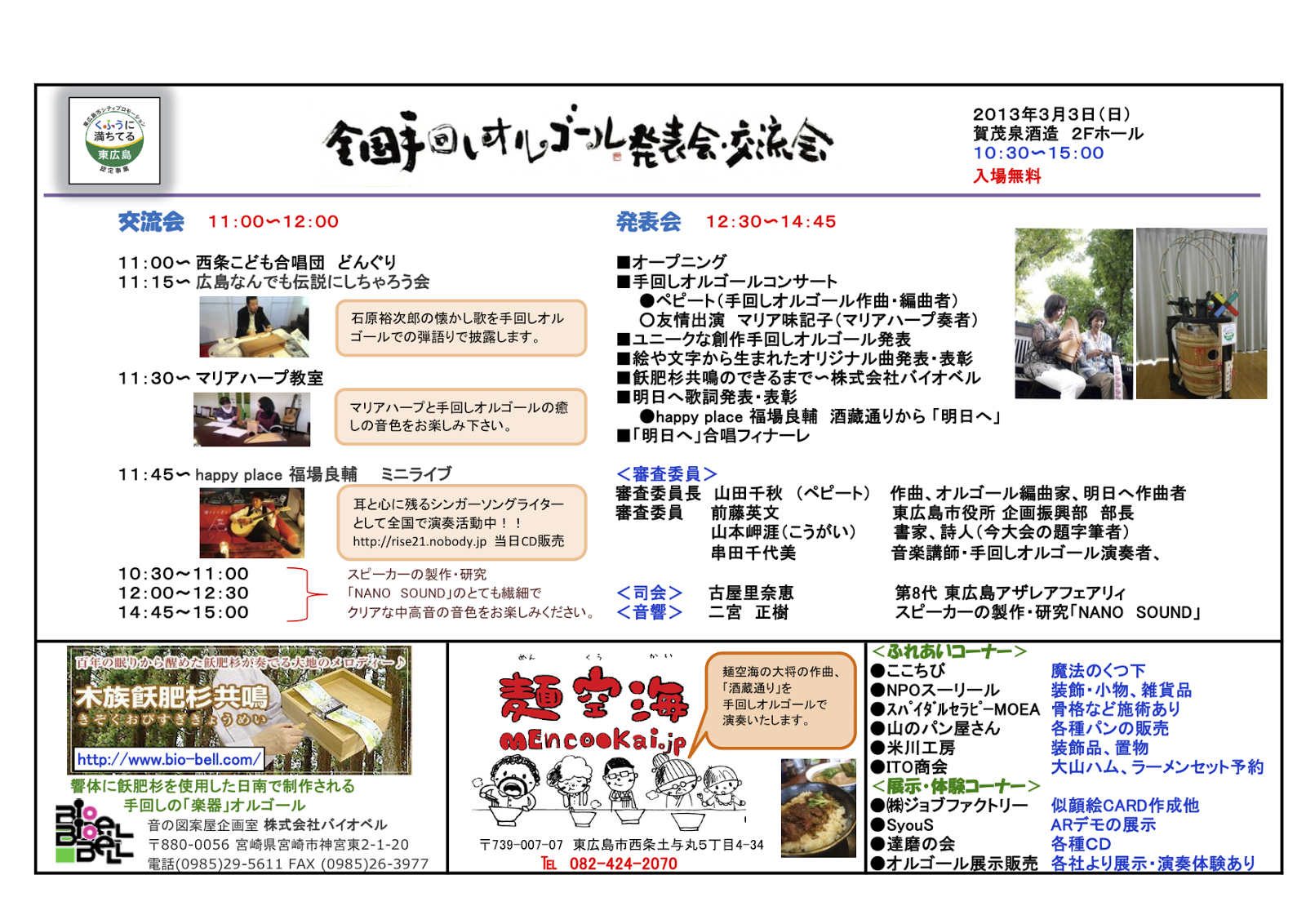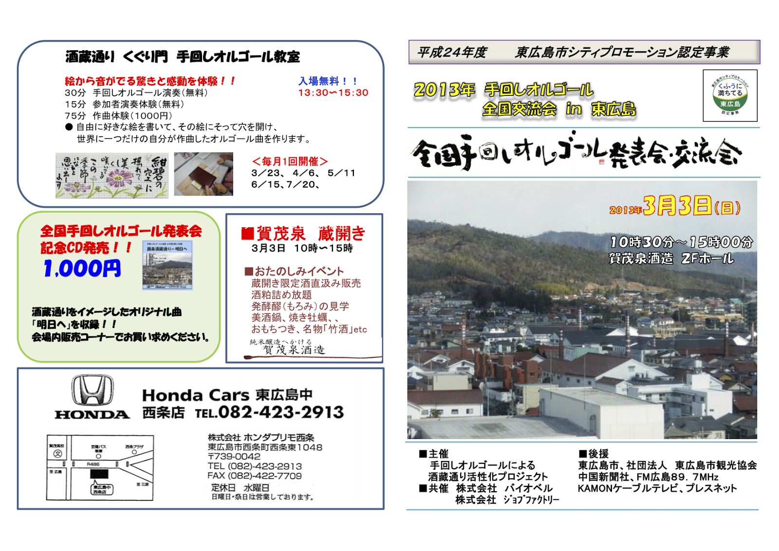 その後、ユニークな創作オルゴールの発表で、田中清人氏に作っていただいたメープルとエピセアのマイオルゴールの説明を、作者に代わっていたします。朝11時から3時までの酒蔵でのイベントには、たくさんの方々が来られるようなので「レコピンヌ」のミニアルバムも販売させていただきます。日本酒もたくさん頂けるようなので、お酒好きな方は西條の酒蔵通りにおいでください〜。