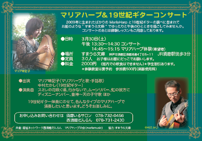 お待たせいたしました。西須磨だんらんと共催でのマリアハープコンサートが、3/30神戸市すまうら文庫で行われます。