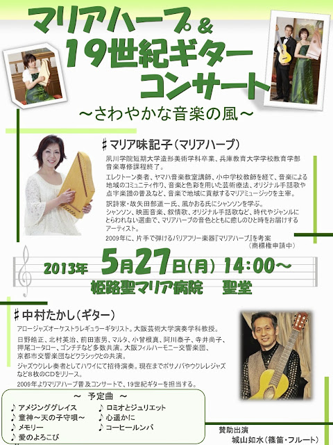 マリアハープ姫路教室生徒で、昨年から研修・準備してきたマリア病院ホスピスでのマリアハープ演奏が、今月から開始されます。