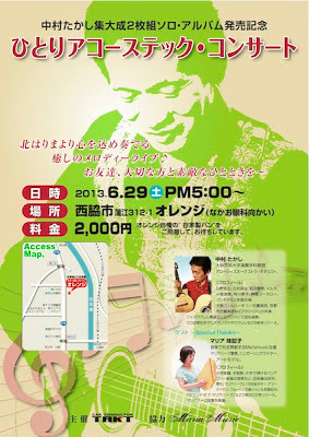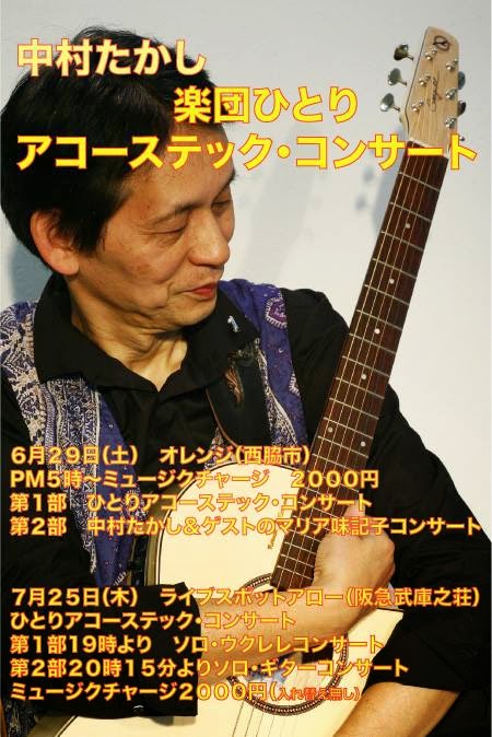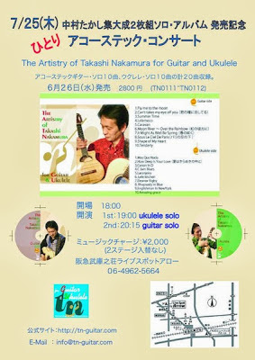 今月末に、西脇市で中村たかしさんのコンサートがあります。ギターとウクレレの2枚組アルバム発売を記念してカーディーラー "TAKUT " 社の主催で行われます。