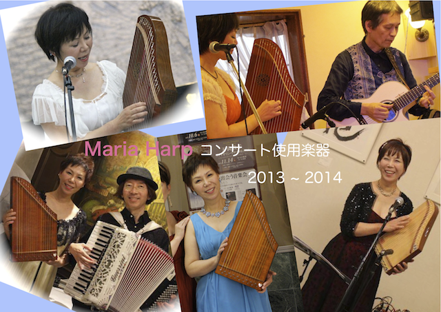 2013年のマリアハープコンサート使用楽器写真 マリア・中村たかしさん・渡辺邦孝さん |