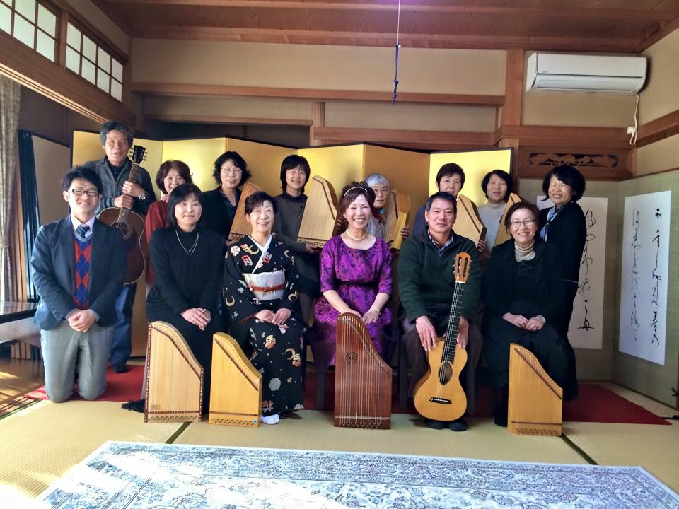 レッスンは9日から始まりました。そして10日は、マリアハープ教室の看板を揚げています三木市画廊喫茶風らんで、新年の音始めの会を開きました。楽器製作家 田中清人さんのワークショップで、初心に戻って基本動作の練習などをたっぷりとおさらいしたり。