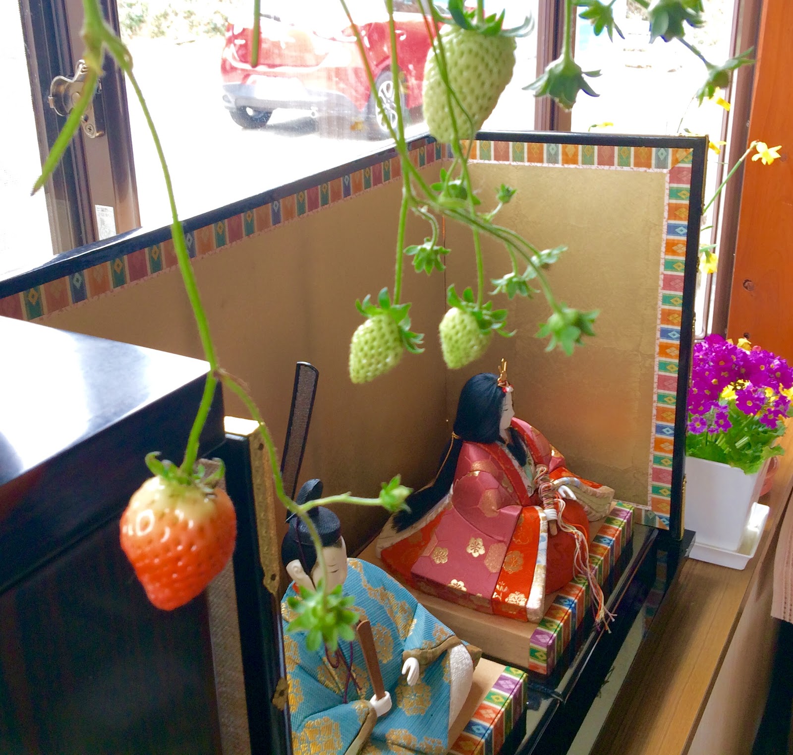 ちょっと早いけれど、お雛様を飾りました。イチゴも赤らんでいい感じです。