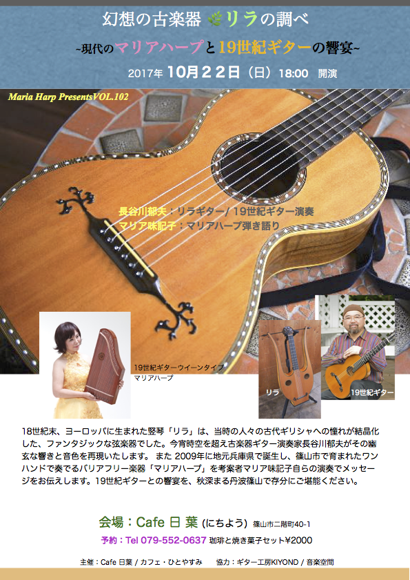 今回の一番の課題、ピッチの異なるリラギターとの共演ですが、選曲の工夫とカポタストを使うことでクリアできました。(マリアハープより一音低いので。)
